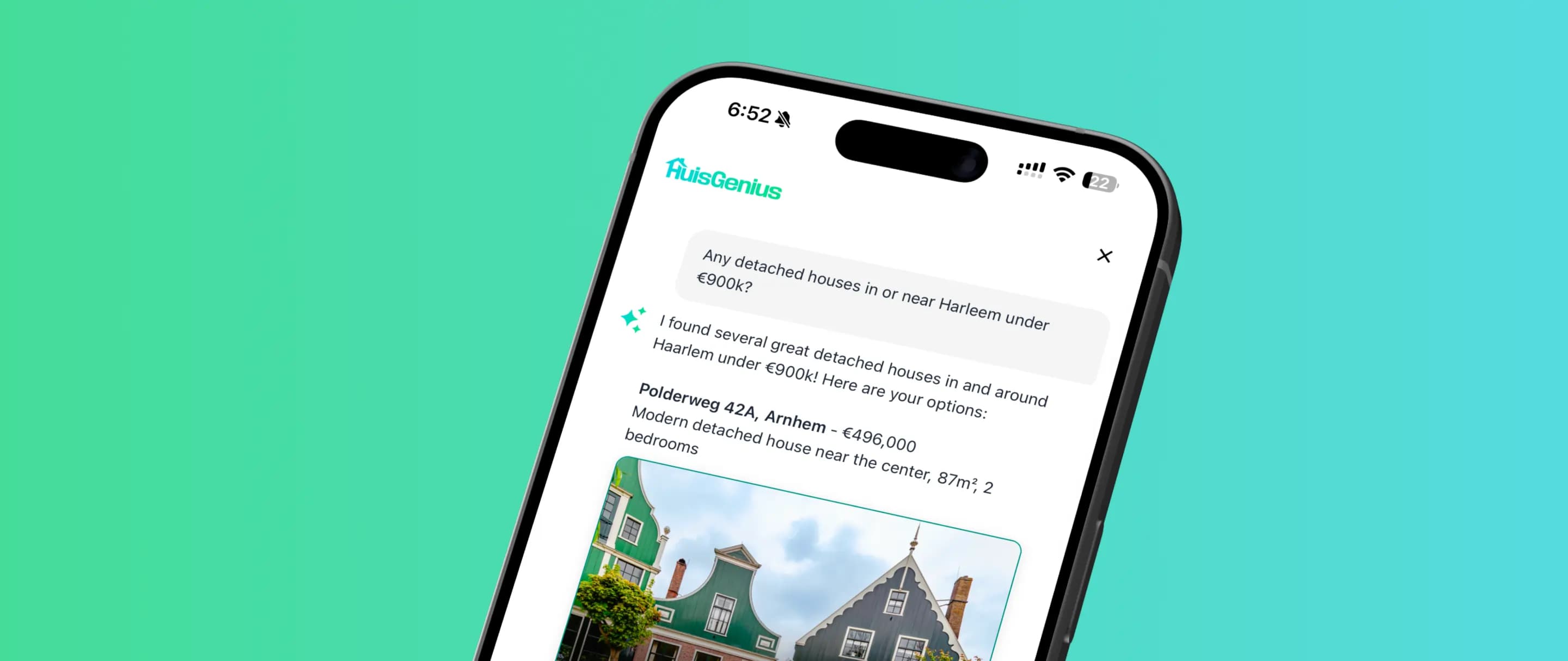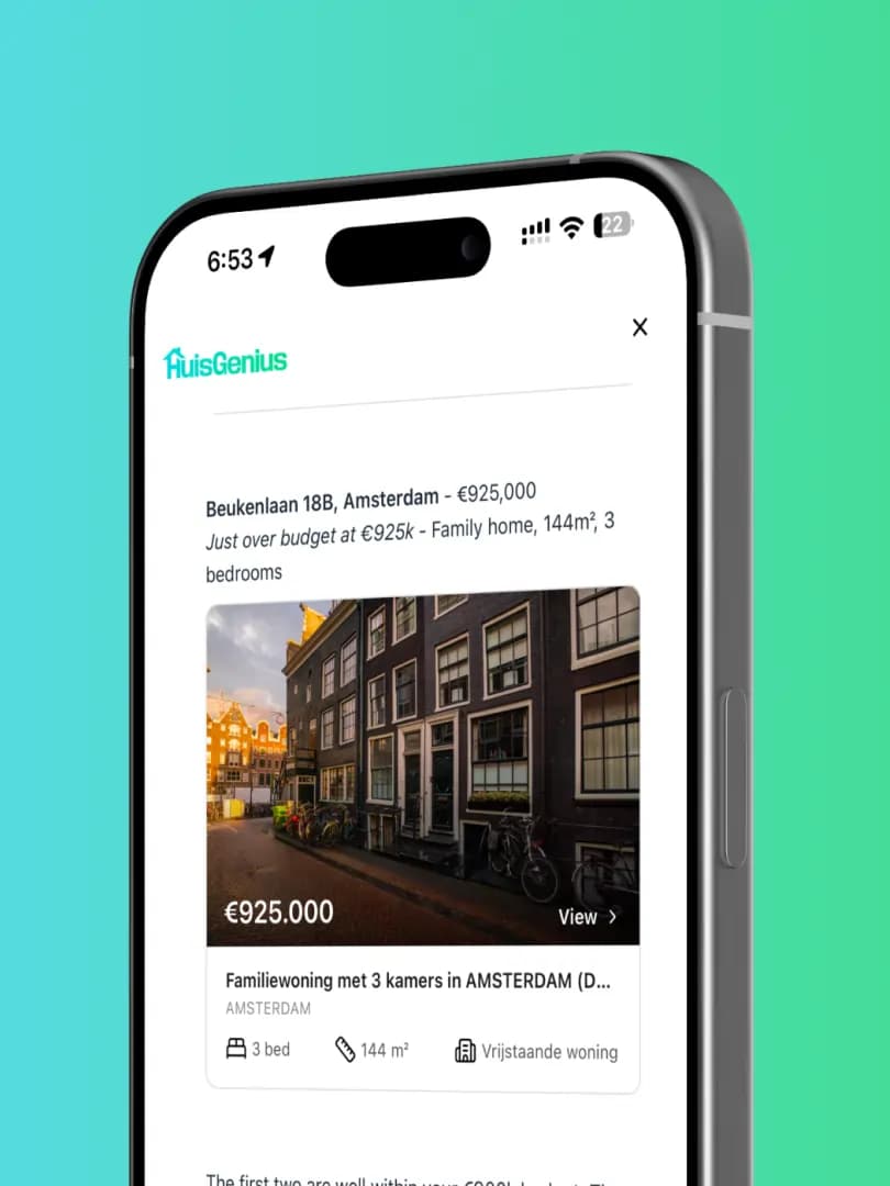 Every answer comes straight from the agency's own Realworks account. When a visitor asks 'do you have family homes in Haarlem under 500k?', HuisGenius shows actual available properties — not guesses, not outdated info. Real homes, real prices, real availability.
