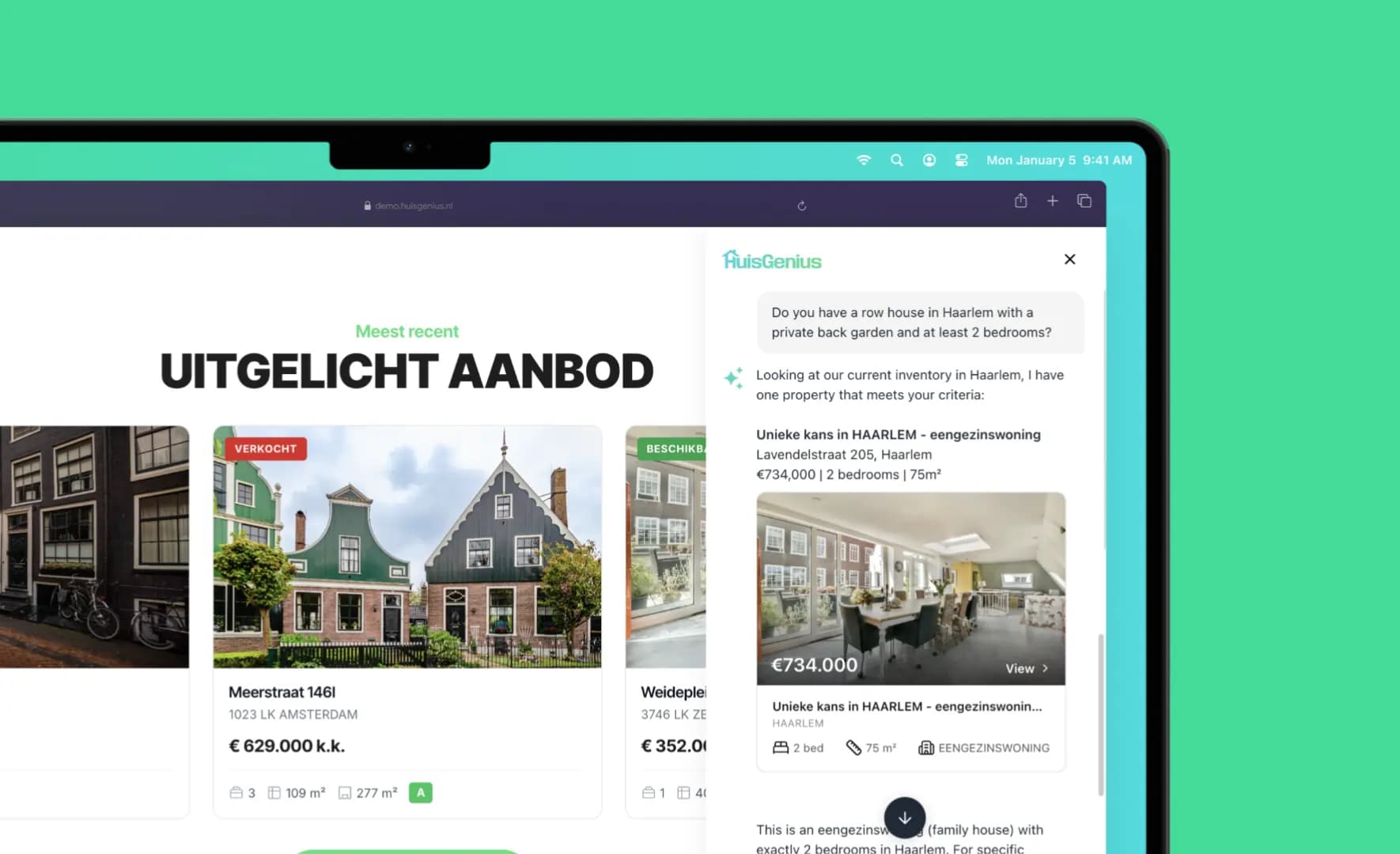 HuisGenius greets website visitors, asks what they're looking for, and shows matching homes with real prices and details — all within the conversation. It spots visitors who keep coming back or browse for a long time and reaches out before they leave. Every lead is delivered to the agent with the full conversation attached.