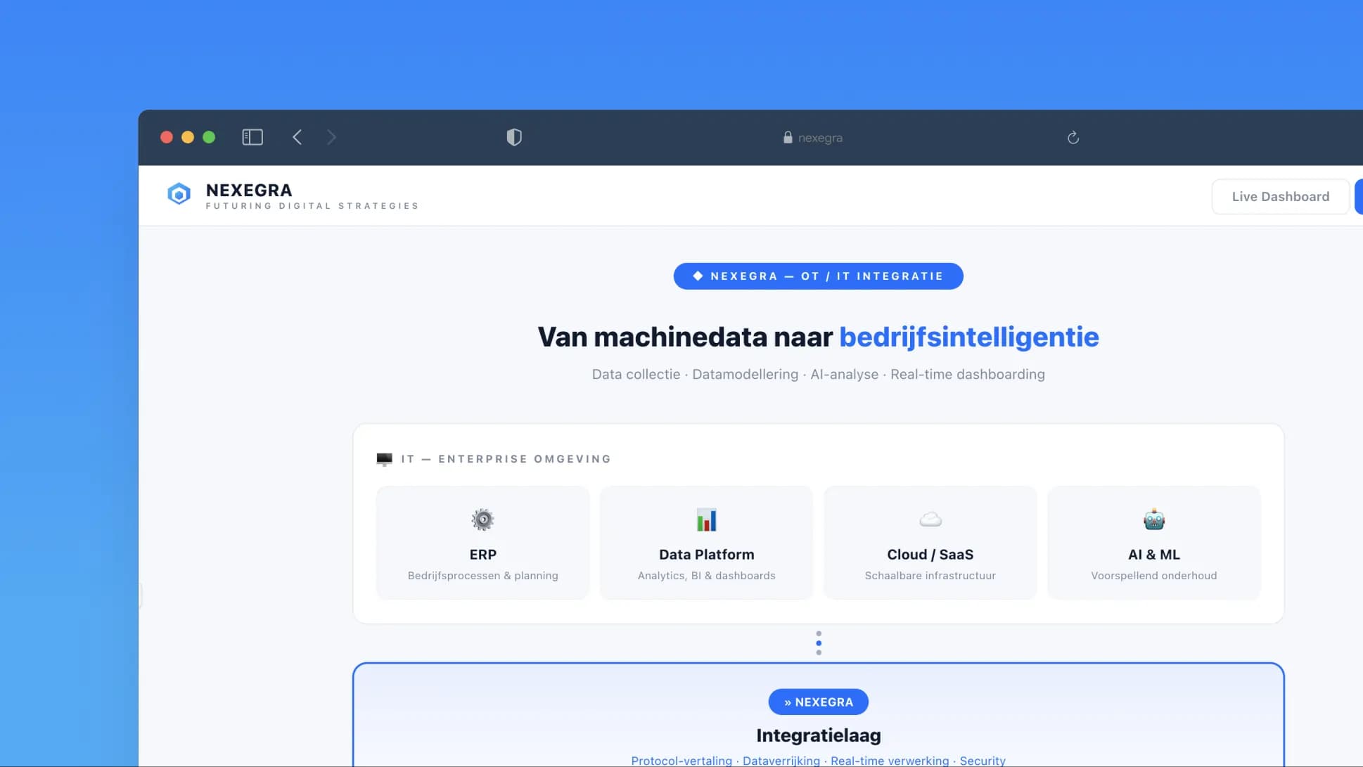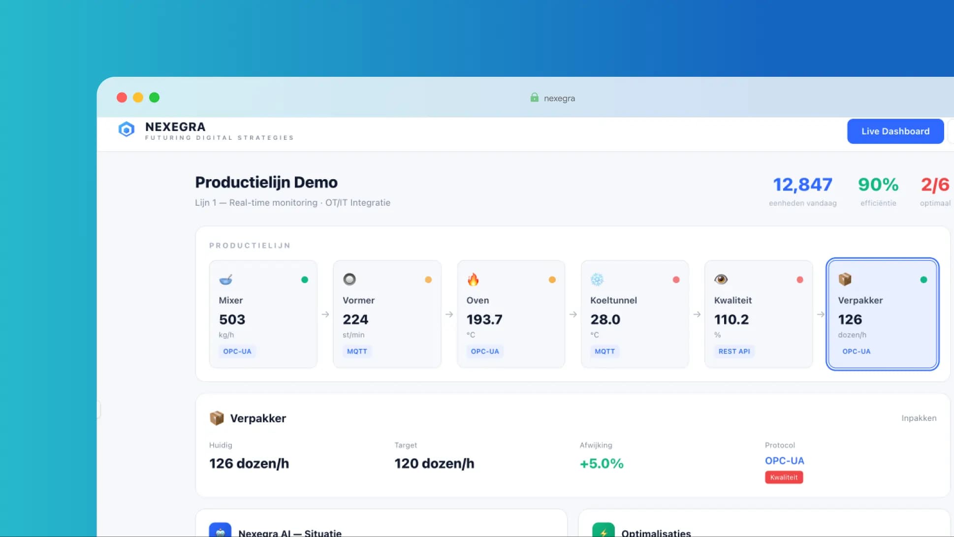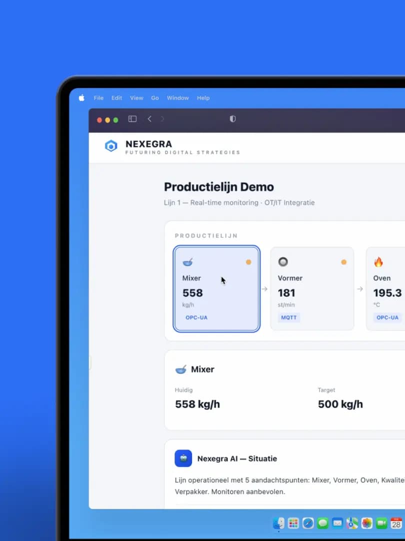 Nexegra is an industrial AI platform that bridges the gap between operational technology (OT) on the production floor and enterprise IT systems. Deployed at Van Dongen Bakkerijen — a mid-size industrial bakery running 3 production lines with equipment from Siemens, Beckhoff and Allen-Bradley.