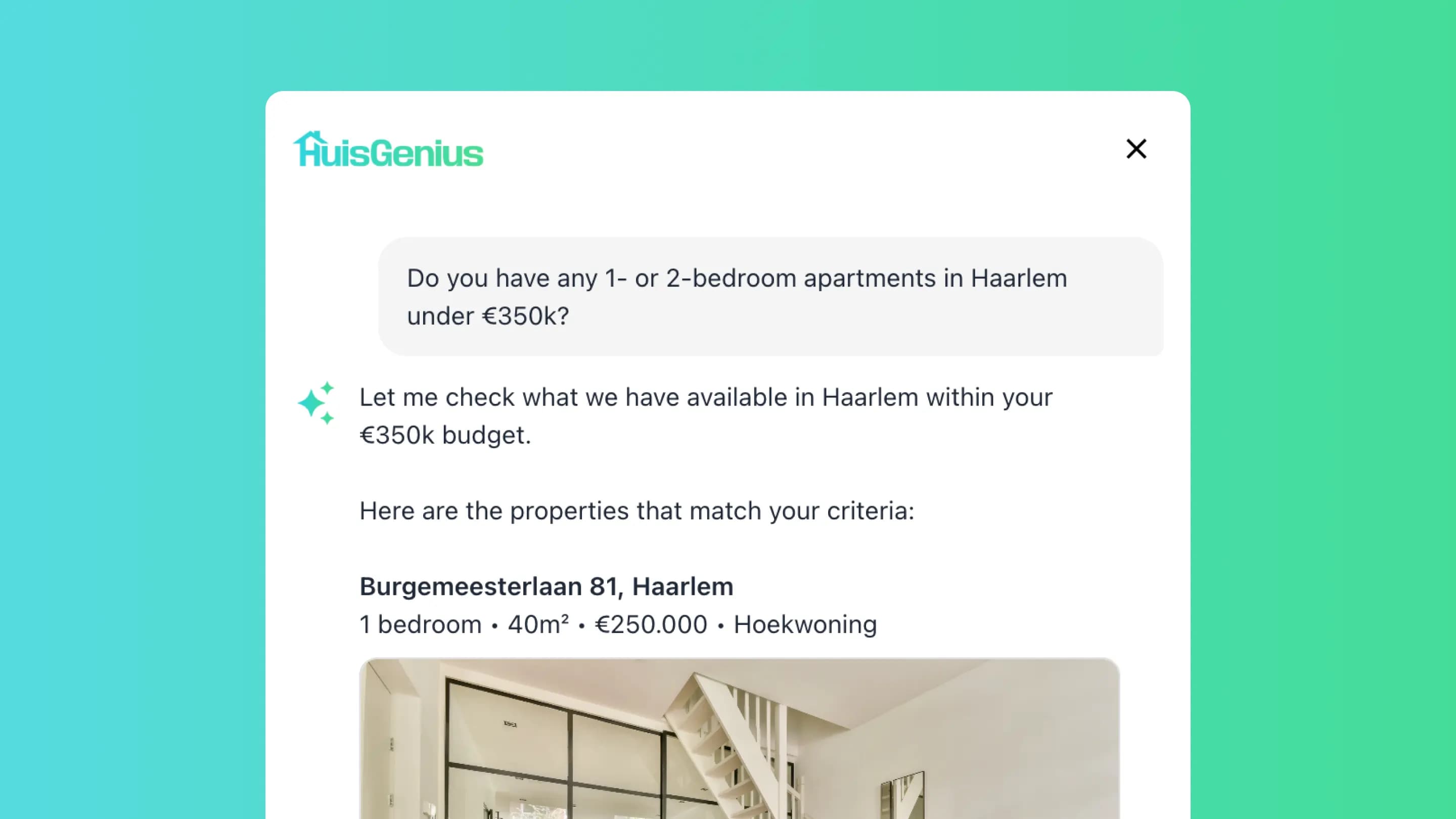 Every answer comes straight from the agency's own Realworks account. When a visitor asks 'do you have family homes in Haarlem under 500k?', HuisGenius shows actual available properties — not guesses, not outdated info. Real homes, real prices, real availability.