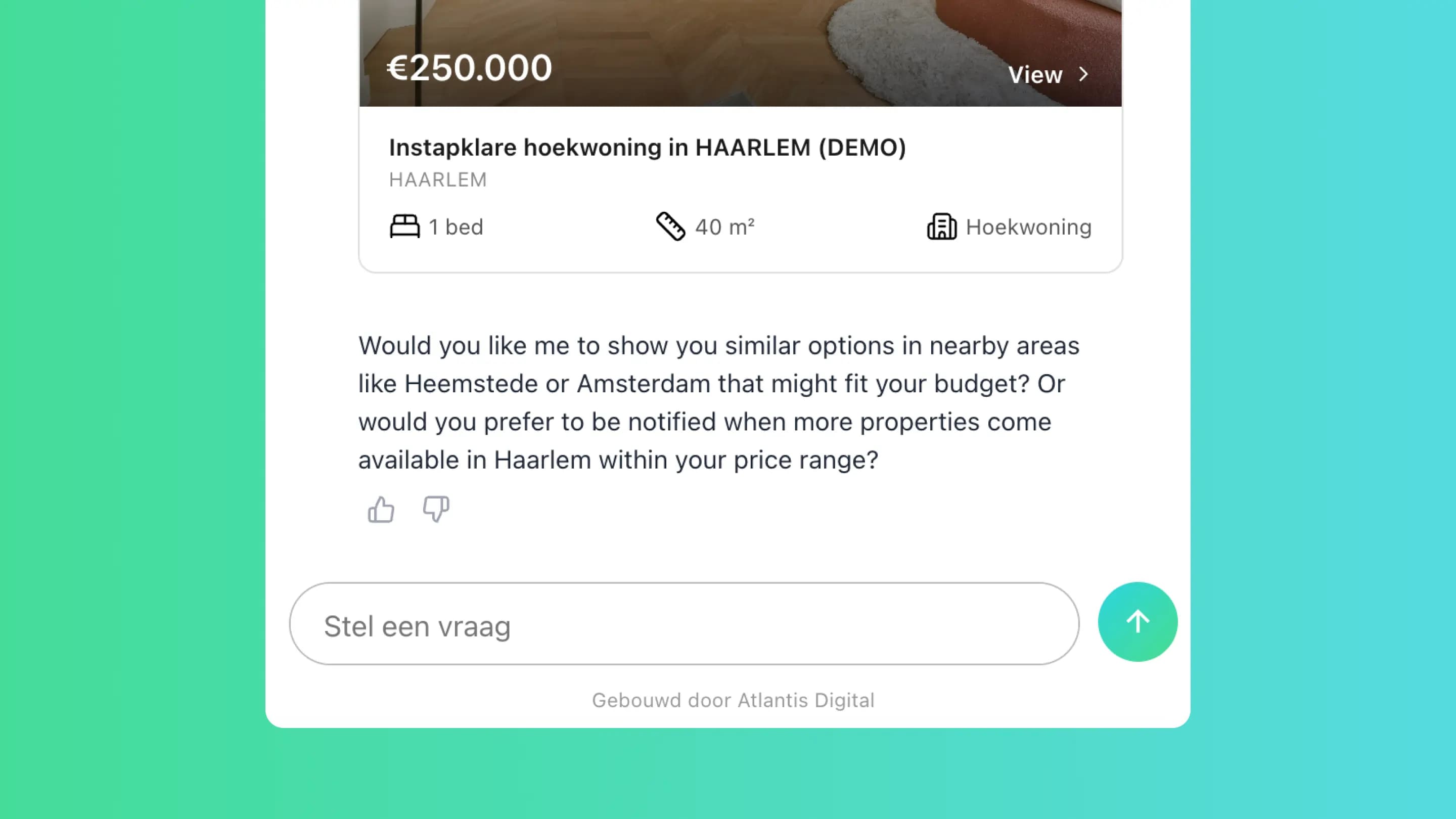 - Smart chatbot for Dutch real estate agencies that connects directly to their property system, shows available homes in conversation, and turns passive website visitors into real leads — around the clock, in Dutch and English.