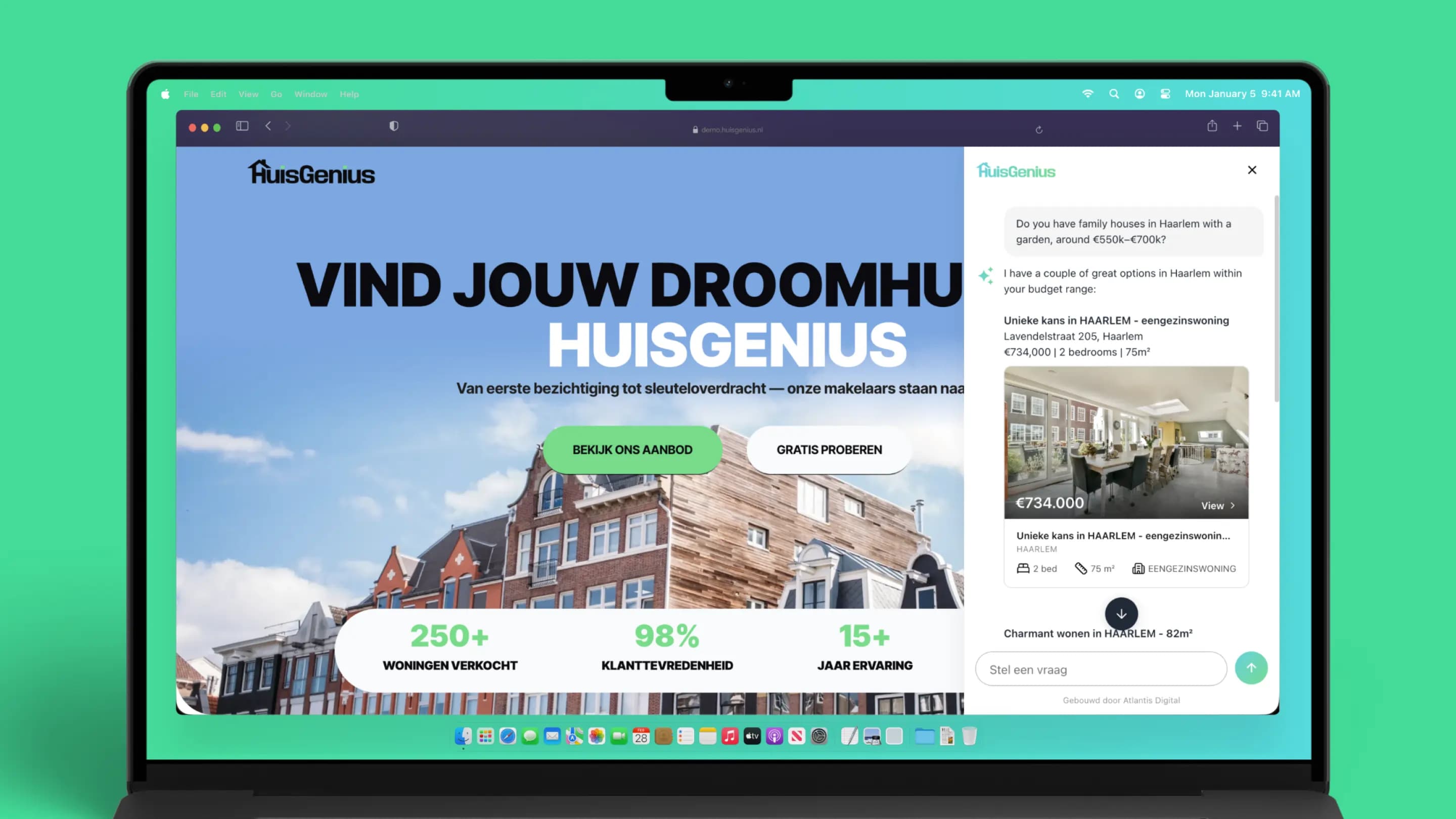 HuisGenius is the first AI chatbot for Dutch real estate agencies that connects directly to Realworks. It shows available homes in natural conversation, qualifies leads automatically, and works around the clock in Dutch and English.