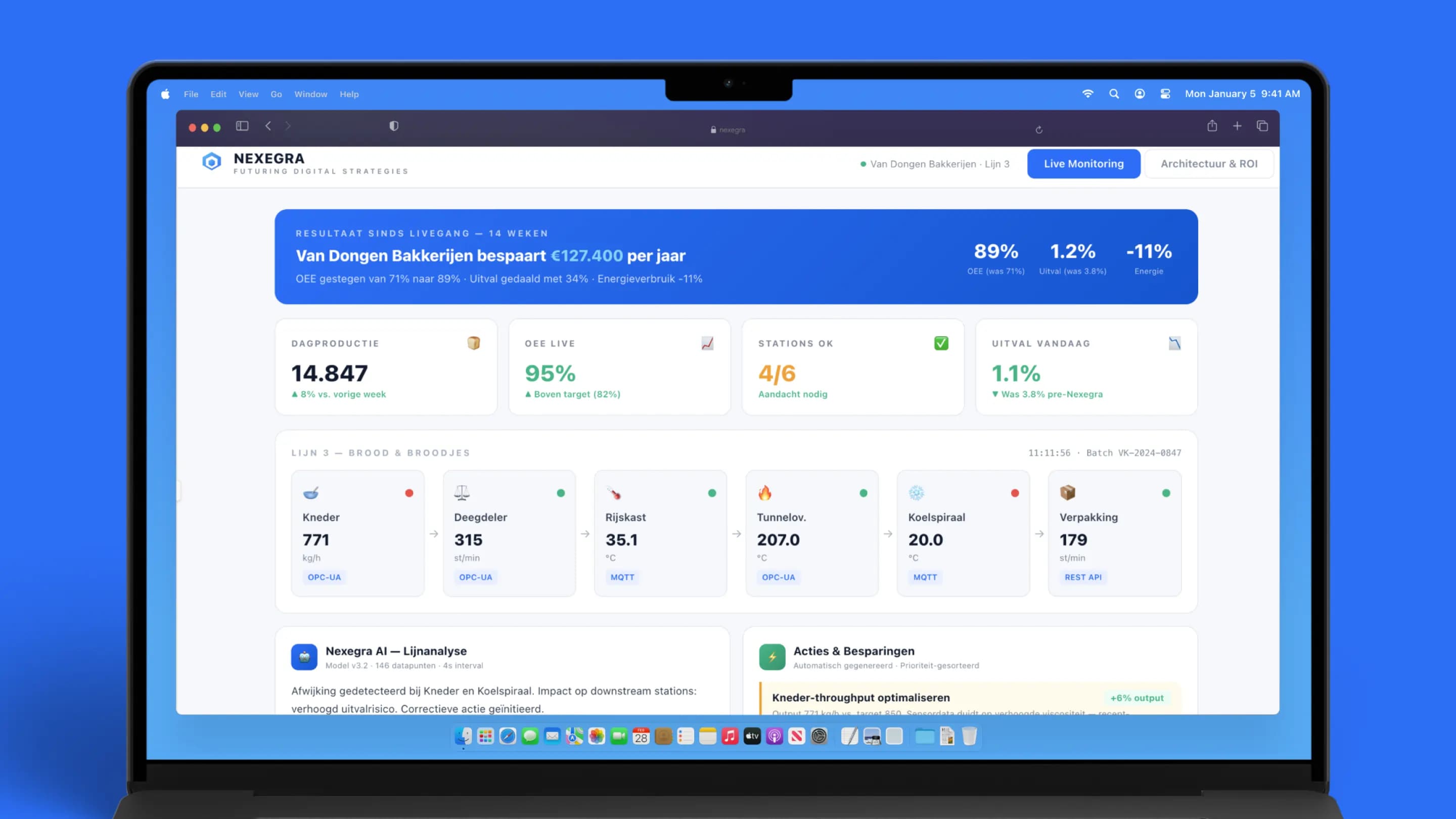 Nexegra is an industrial AI platform that bridges the gap between operational technology (OT) on the production floor and enterprise IT systems. Deployed at Van Dongen Bakkerijen — a mid-size industrial bakery running 3 production lines with equipment from Siemens, Beckhoff and Allen-Bradley.