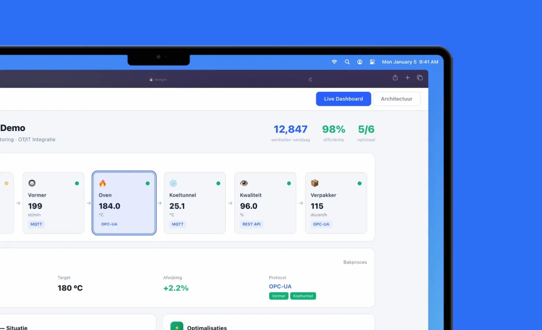 - Industrial AI platform that connects OT and IT systems across production lines, delivering real-time monitoring, AI-driven optimisation and predictive maintenance. Deployed at Van Dongen Bakkerijen across 3 production lines with 146 sensors.